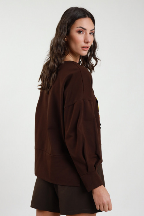 Felpa Raglan con Dettaglio Manica Pizzo e Paillettes, Spilla sul Fronte.