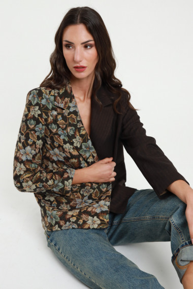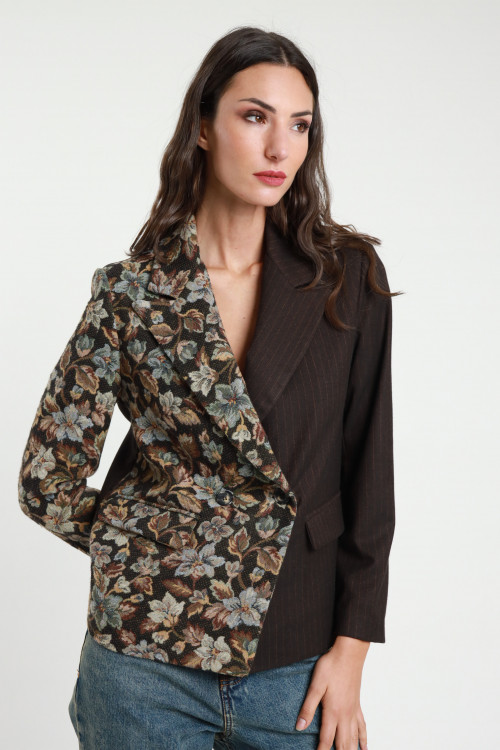 Blazer Doppiopetto con Due Tessuti in Fantasia Mattelassè e Fantasia Gessata. Due Tasche Frontali a Filetto con Pattina.