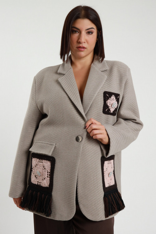 Giacca Over con Patch Uncinetto, Chiusura Monobottone e Tasche Frontali a Filetto con Pattina - Linea Curvy Susy Star.