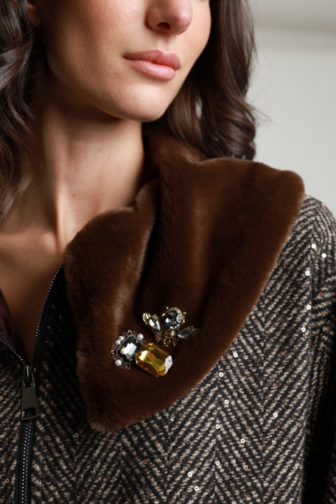 Bomber Spinato con Collo in Epelliccia con Dettaglio Gioiello. Tasche Laterali.