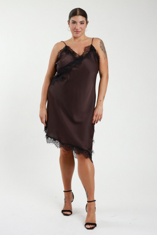 Abito Asimmetrico, Scollo a V, in Effetto Raso con Dettagli in Pizzo - Linea Curvy Susy Star.