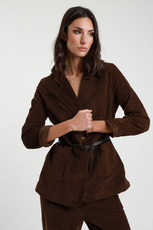Blazer Monopetto in Velluto, Cinturina in Vita e Tasche Applicate.