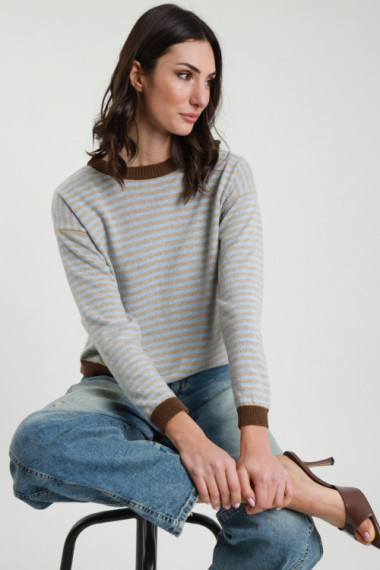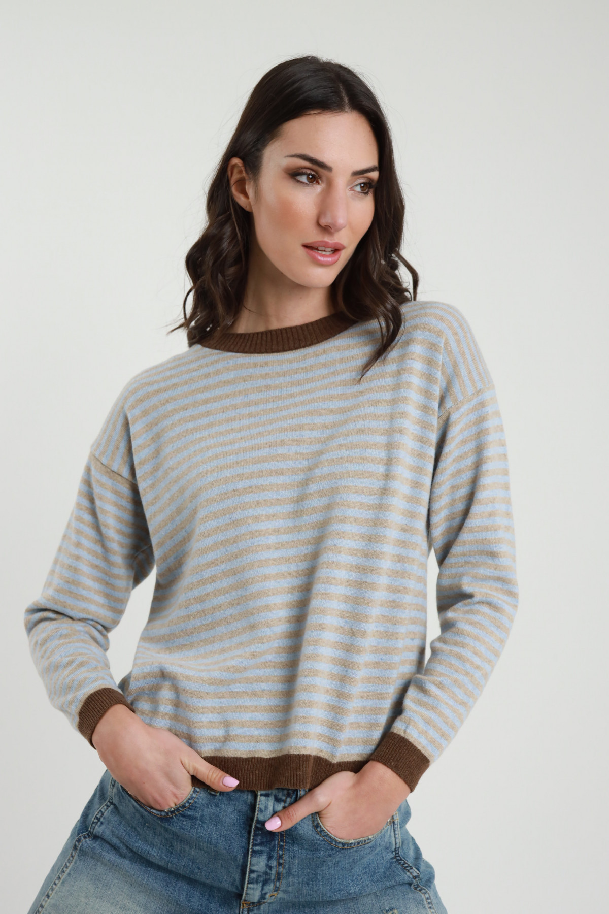 Maglione Girocollo a Righe in Cashmere, Orli a Contrasto.