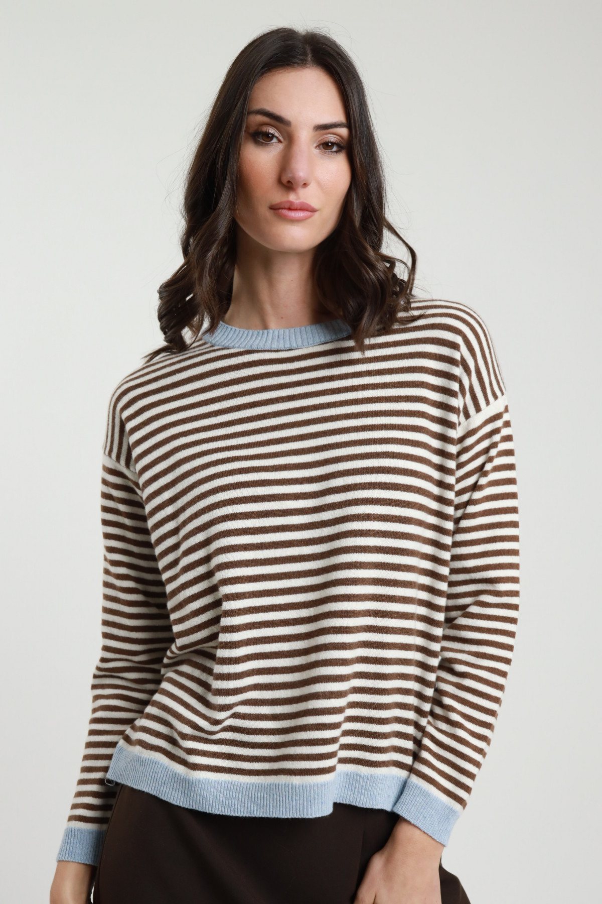 Maglione Girocollo a Righe in Cashmere, Orli a Contrasto.