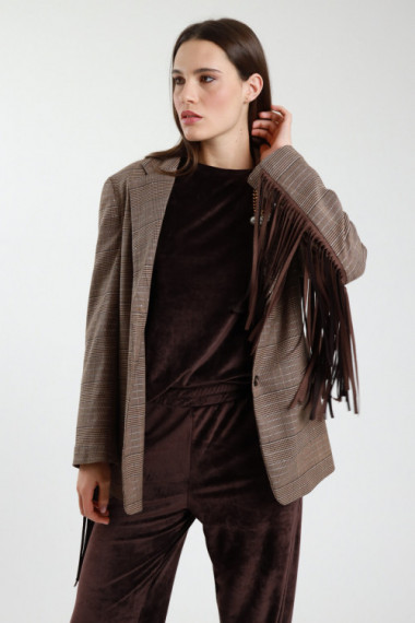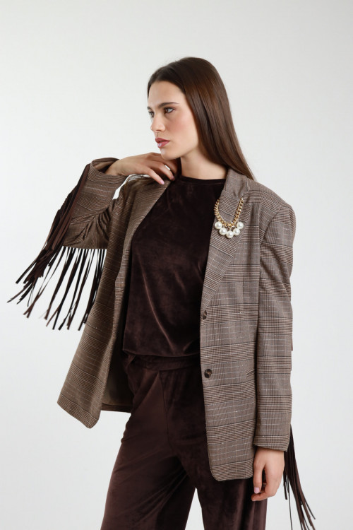 Blazer Monopetto in Fantasia Check e Micro Paillettes con Frange sul Retro e sulle Maniche, Dettaglio Accessorio Perle Removibile.