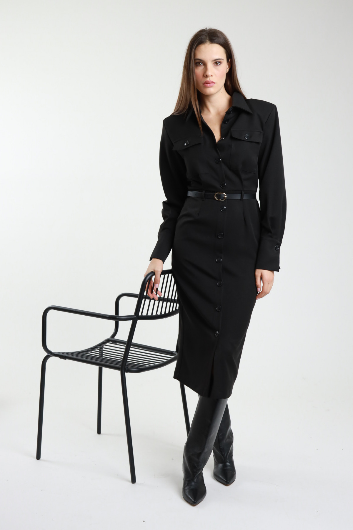 Abito Chemisier Midi con Cintura e Due Tasche Frontali.