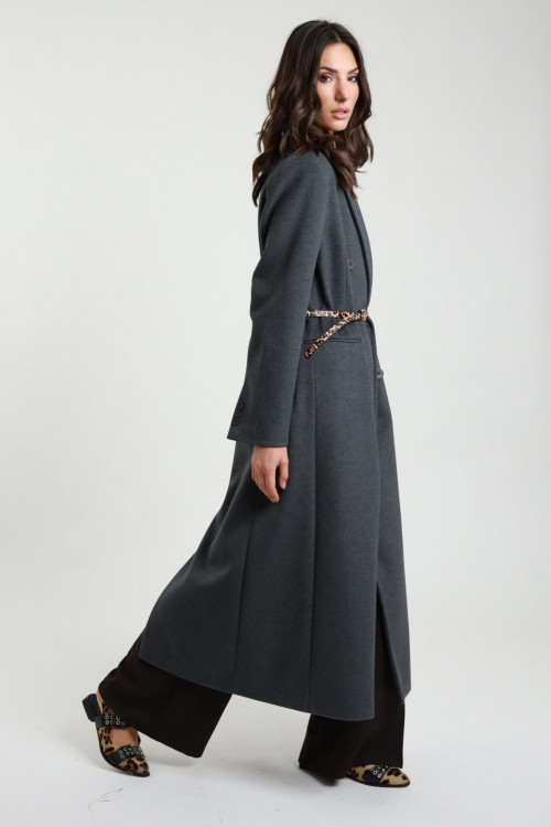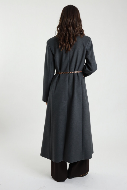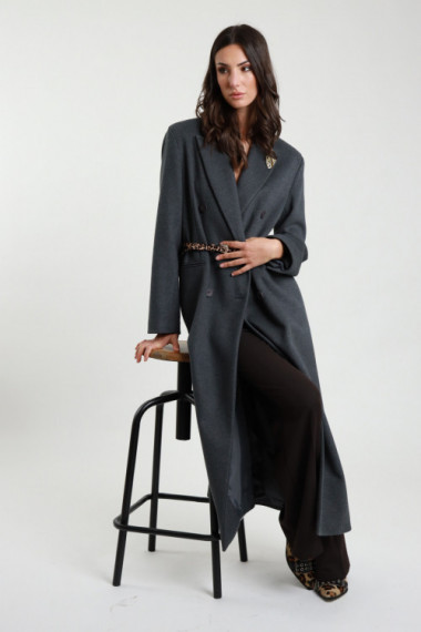 Cappotto Lungo Doppiopetto con Cintura Maculata e Spilla Applicata sul Rever. Tasche Frontali a Filetto e Spacco sul Retro.