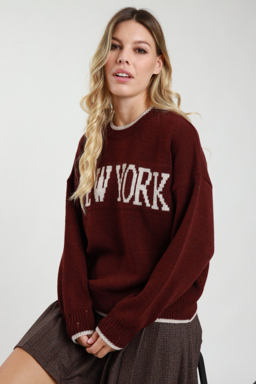 Maglione Girocollo con Bordi e Scritta "New York" a Contrasto, Rotture sul Fondo.