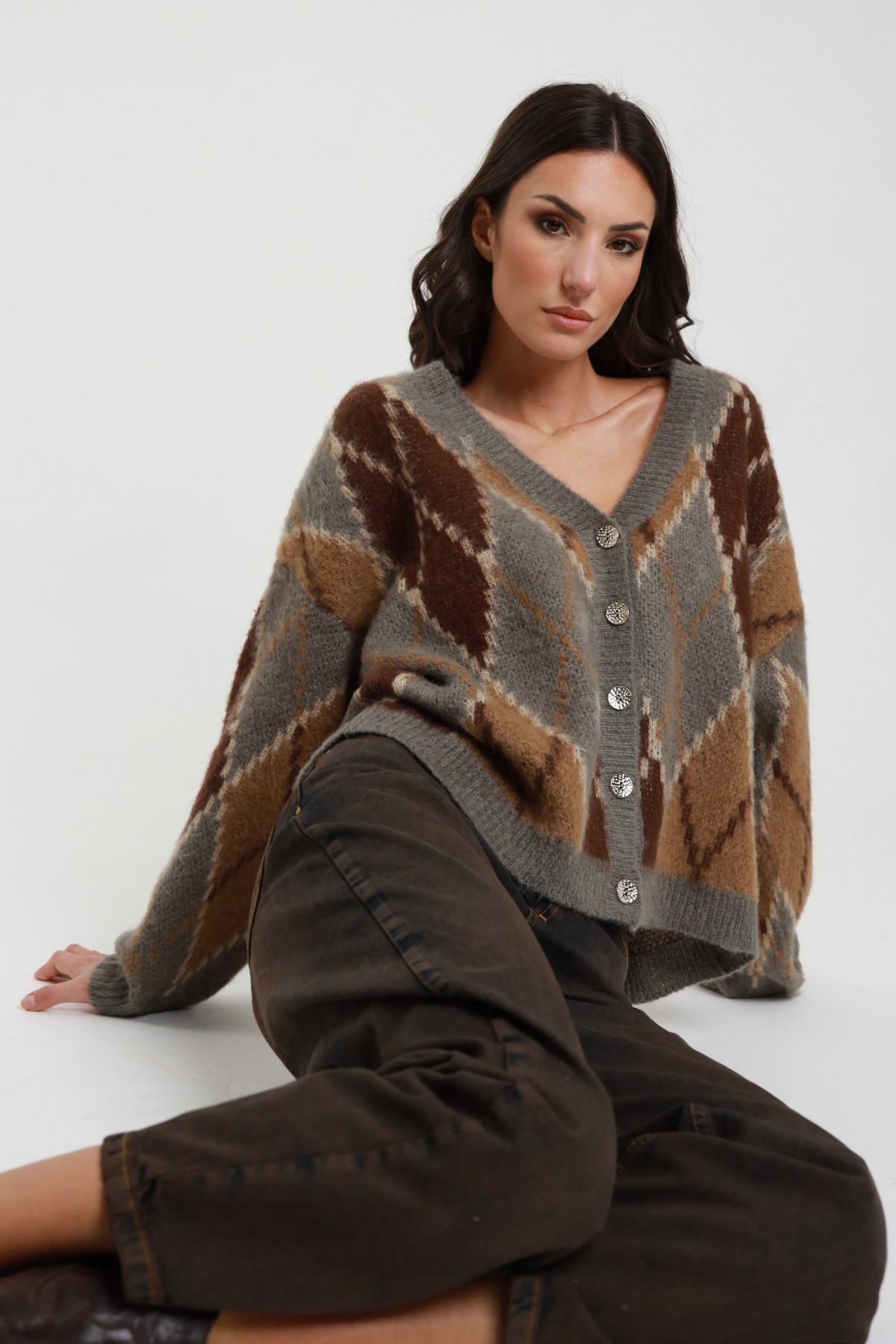 Cardigan Over Scollo V a Quadri, Chiusura Bottoni Gioiello.