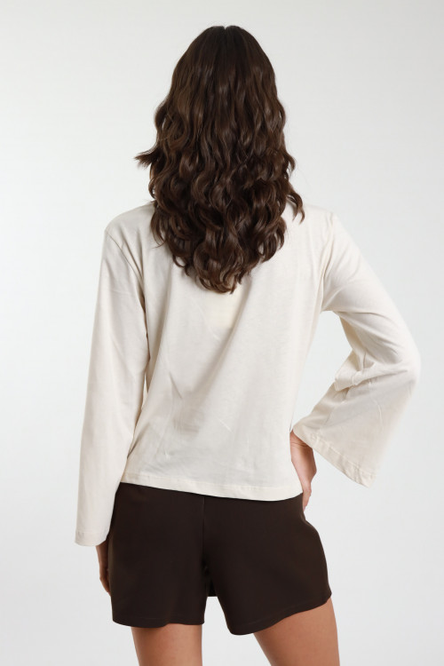 T-Shirt Girocollo con Dettaglio Maniche Lunghe in Pizzo, Scritta ''Good'' e Applicazione Fiocco.