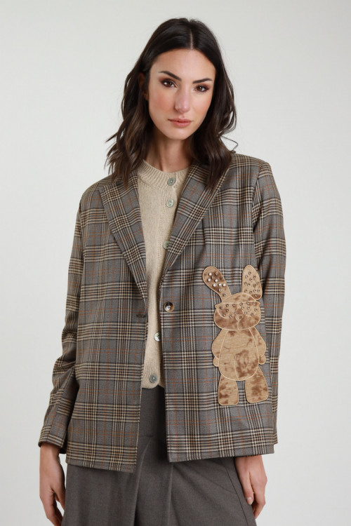 Blazer Monopetto in Fantasia Check con Patch Coniglio e Strass Applicato sul Lato.
