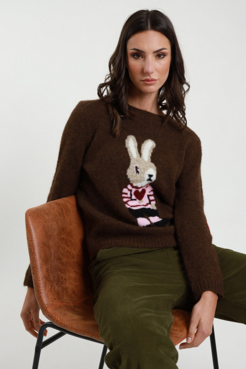 Maglione Girocollo con Intarsio Coniglio sul Fronte e Cuoricini sulle Maniche.