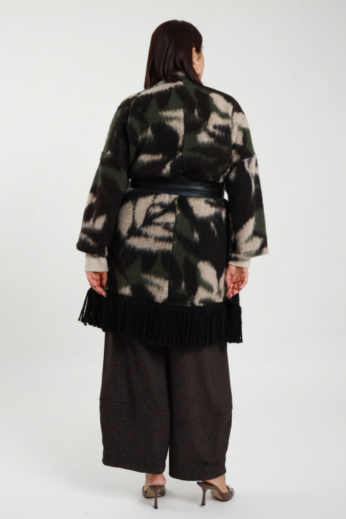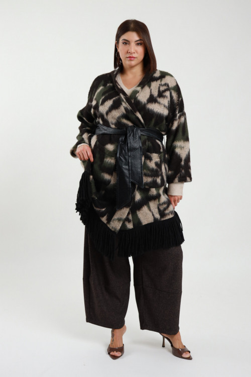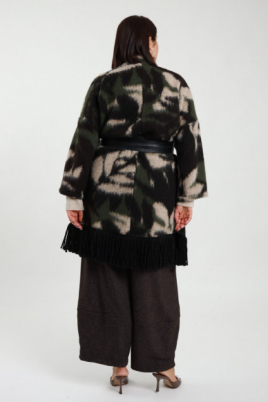 Cappotto Jacquard con Tasche Laterali Applicate, Frange sul Fondo e Fusciacca in Ecopelle.