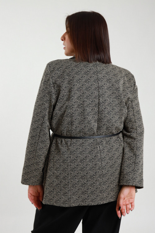 Blazer Monopetto Effetto Spigato con Cinturina in Vita, Tasche Laterali con Pattina, Spilla sul Rever - Linea Curvy Susy Star.