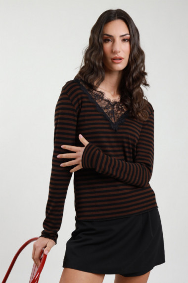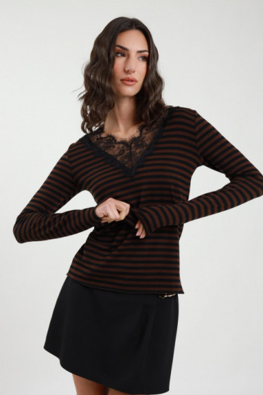 T-Shirt a Righe Scollo V con Pizzo