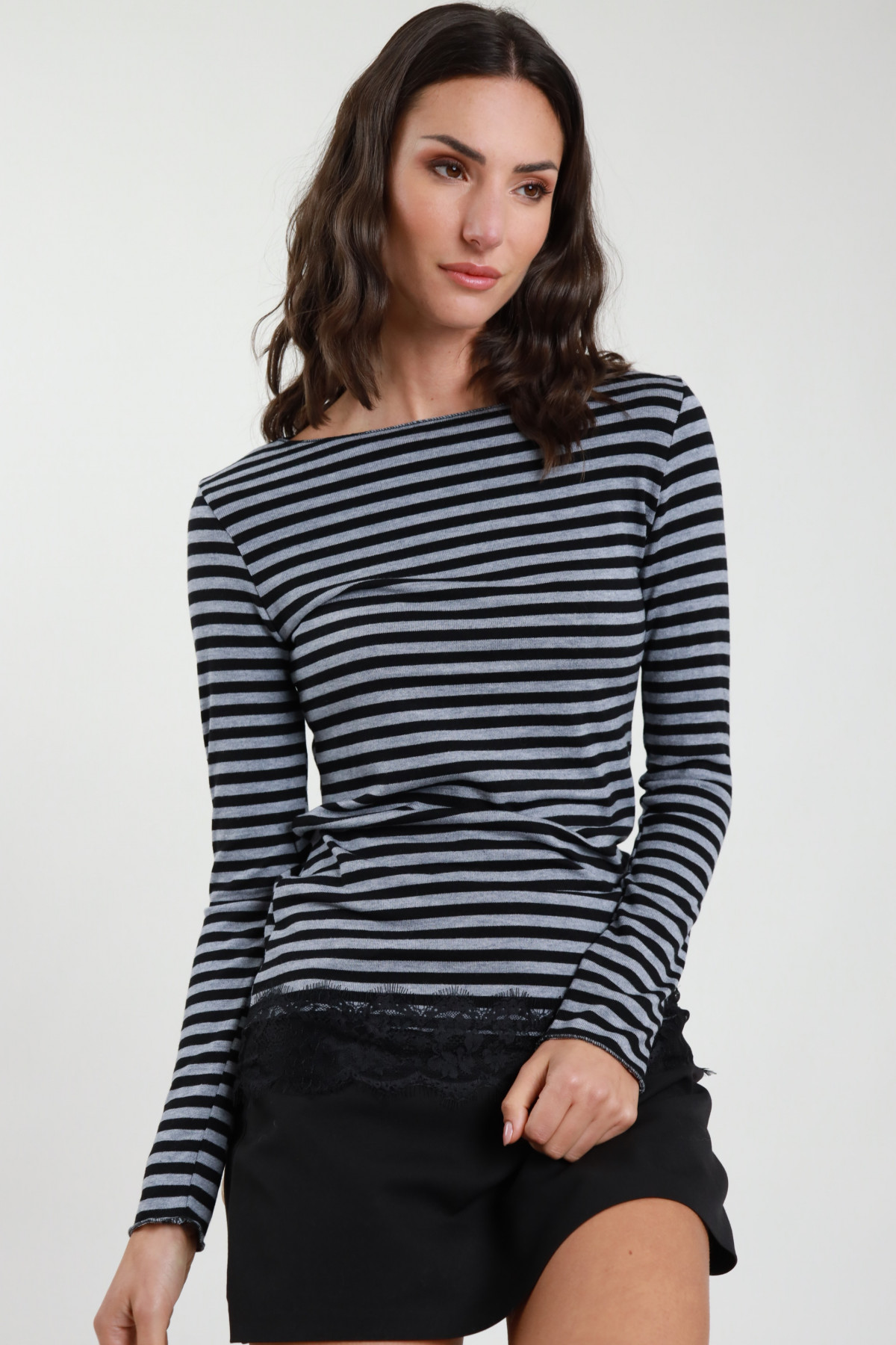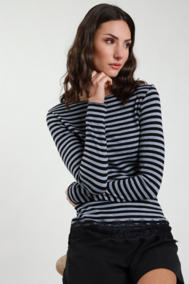 T-Shirt in Viscosa Elasticizzata con Maniche Lunghe in Fantasia Righe con Pizzo sul Fondo.