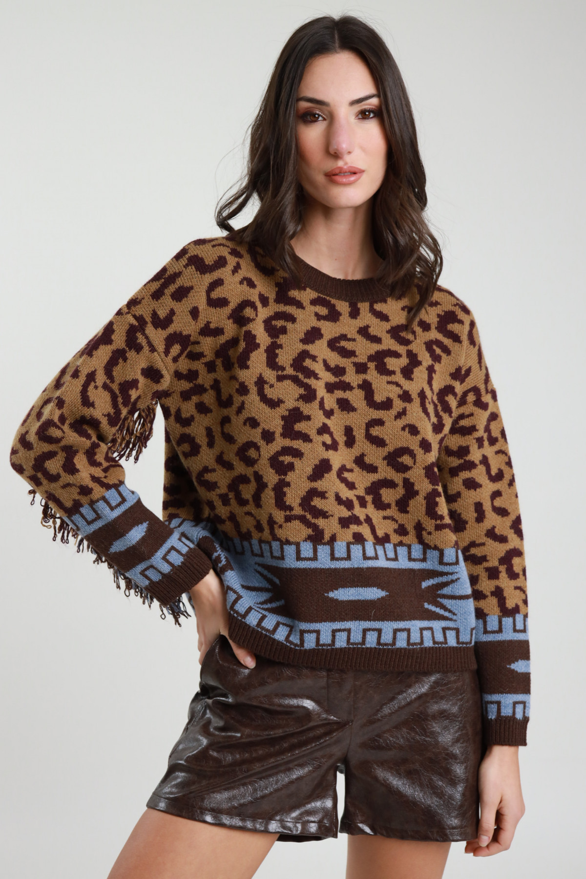 Maglione Jacquard Crop con Frange sulle Maniche.