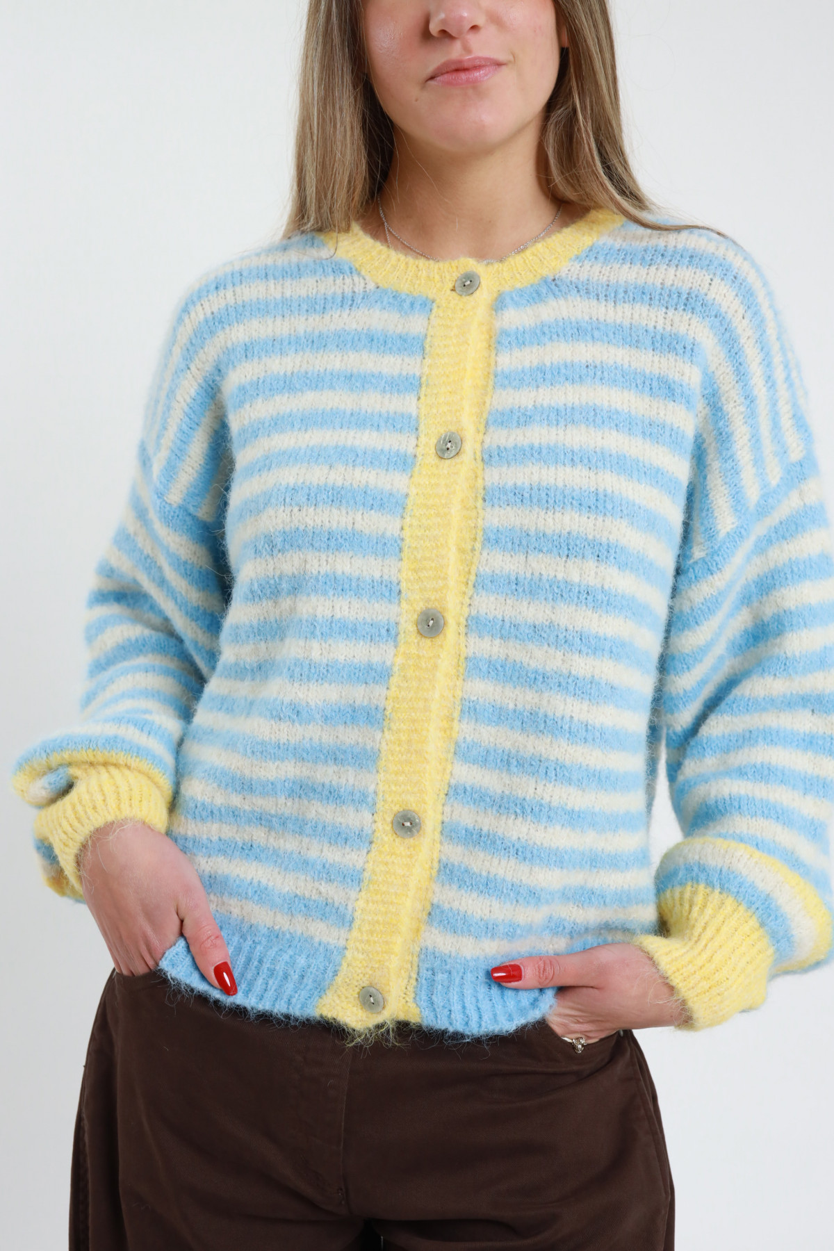 Cardigan Con Scollo Coreano Rigato Con Bordature A Contrasto e Maniche A Sbuffo.