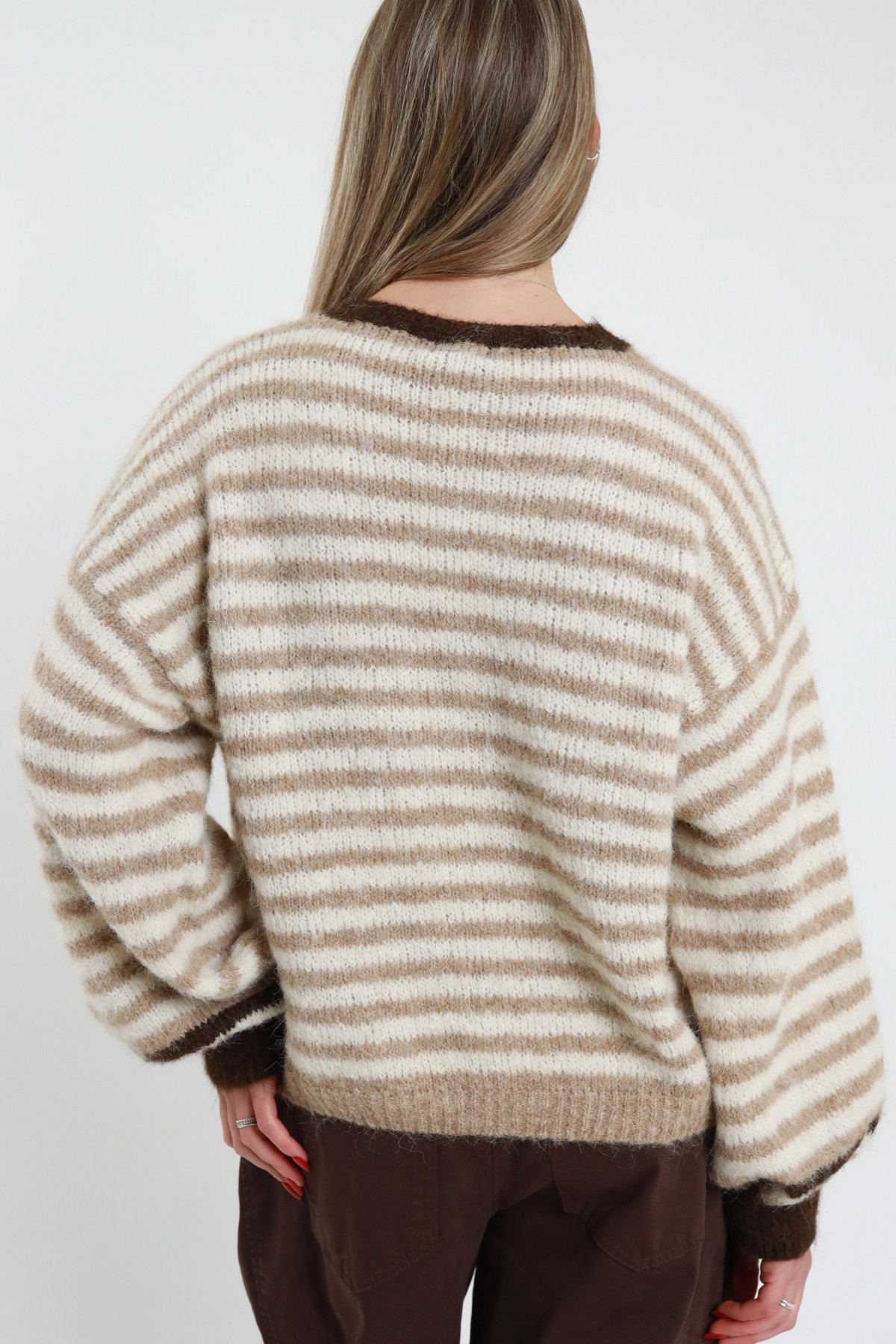 Cardigan Con Scollo Coreano Rigato Con Bordature A Contrasto e Maniche A Sbuffo.