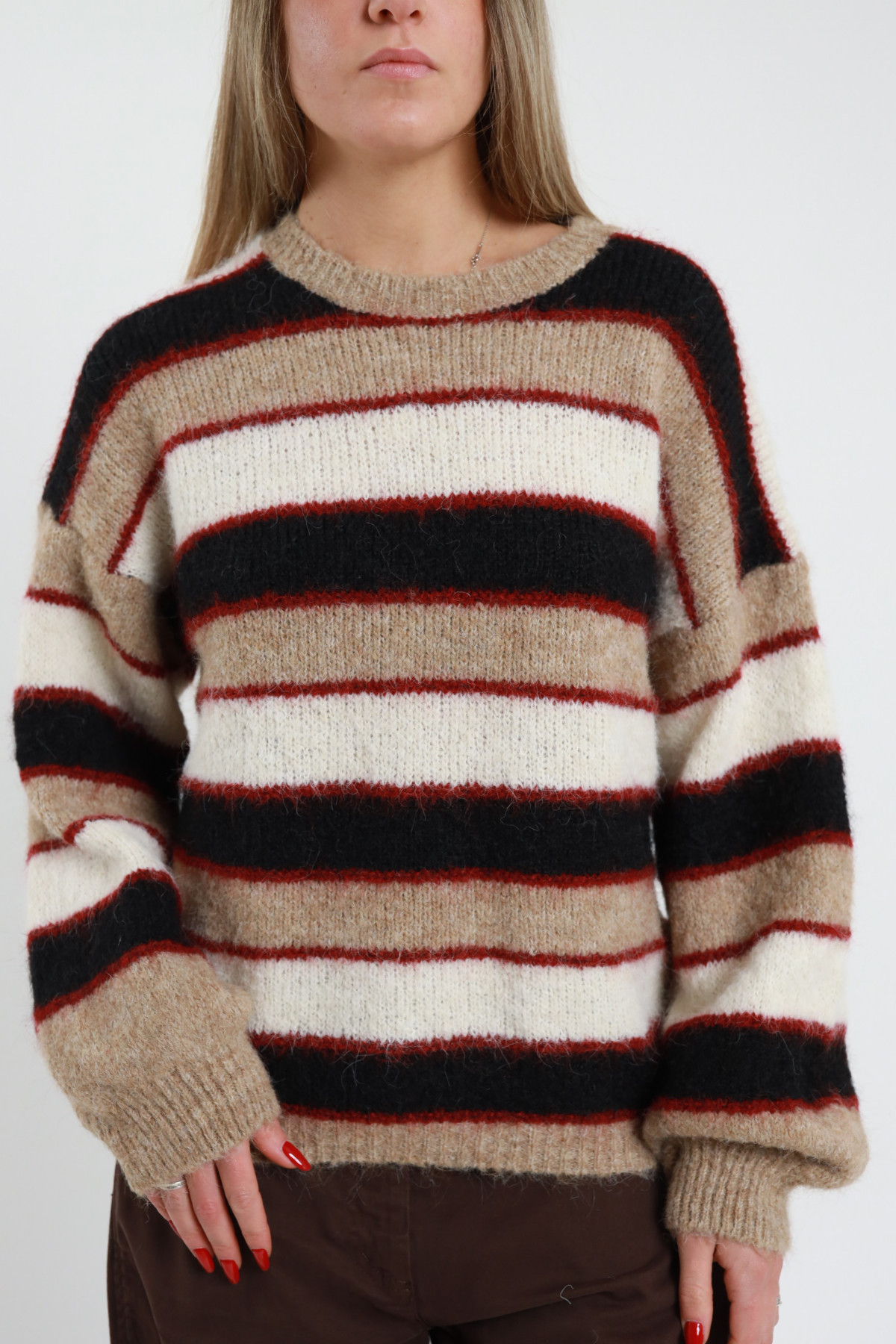Maglioncino Girocollo Rigato Over Con Maniche A Sbuffo. 59%rPet 21%pa 11%pl 8%wo 1%ea